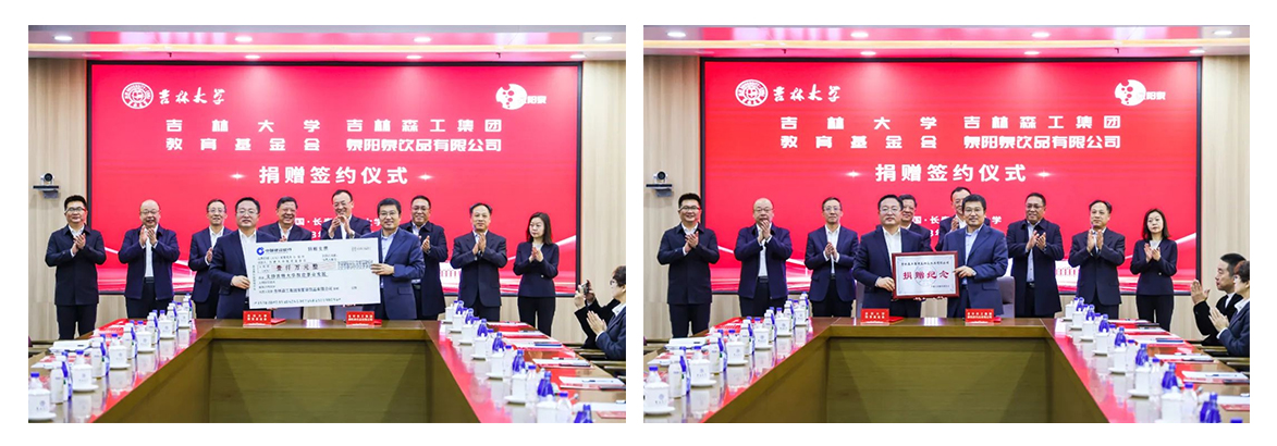 吉林森工集團(tuán)泉陽泉飲品有限公司黨委副書記、總經(jīng)理黃碩與吉林大學(xué)校友和基金工作辦公室主任、教育基金會秘書長康永剛簽訂捐贈協(xié)議。